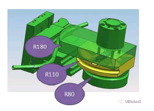 對于不能實現(xiàn)一管一模的情況,譬如客戶的裝配界面空間狹小,管路走向布局有限,導(dǎo)致一管多半徑或直線段較短的情況出現(xiàn),這時,在設(shè)計彎管模時,考慮雙層?;蚨鄬幽#壳拔宜镜膹澒茉O(shè)備最多支持3層模的設(shè)計),甚至是多層復(fù)合模。