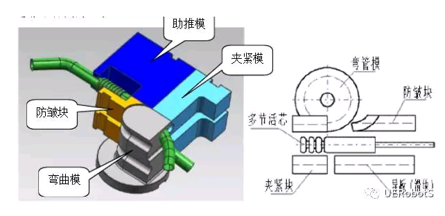 彎曲模 2.芯棒頭3.防皺塊4.管子5.芯棒桿6.夾緊塊7.助推模