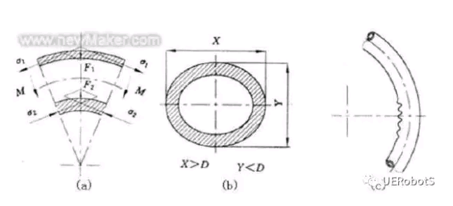 彎管機在進行工作運行時,在內(nèi)壓應(yīng)力作用下,(內(nèi)壓應(yīng)力狀態(tài)參考配管力學(xué))將使圓形的橫截面趨于橢圓,產(chǎn)生短軸及長軸。在長軸處產(chǎn)生附加應(yīng)力,此應(yīng)力屬于局部應(yīng)力。橢圓度愈大,此附加應(yīng)力也愈大,甚至形成高應(yīng)力區(qū),出現(xiàn)局部塑性變形,達到一定值后,將導(dǎo)致彎管承載能力減低而破壞。