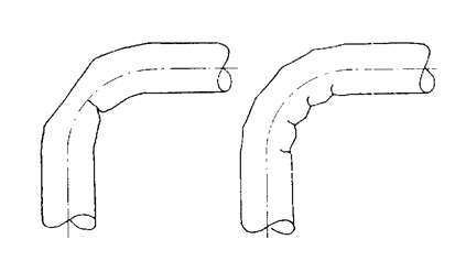 扭曲或有皺折的彎——管子可能發(fā)生扭曲或皺折,如圖5。這可能是因?yàn)椴牧嫌?,不向彎曲?nèi)徑收縮。不能收縮的管材,向管子中心線內(nèi)凹。(如材料不是太硬)這種情況可按圖4設(shè)置工裝來改進(jìn)。如是在表1的范圍以內(nèi),管子有皺折可以使用插入式芯棒(圖6)。