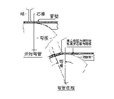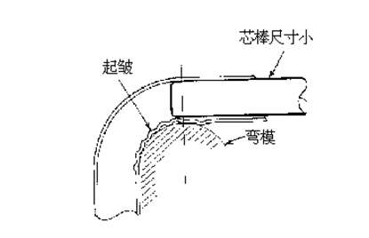 芯棒太靠前——芯棒太靠前有幾個(gè)后果。在彎外側(cè)切點(diǎn)末端處會(huì)有凸起,彎內(nèi)側(cè)切點(diǎn)開始處會(huì)有一個(gè)凹陷。這些變形在一根管子上例舉。但由于芯棒形狀和彎曲半徑的不同,不總是同時(shí)出現(xiàn)。凸起顯然是由芯棒引起的。凹陷因?yàn)樾景魧⒐茏忧穗x彎模而形成。
